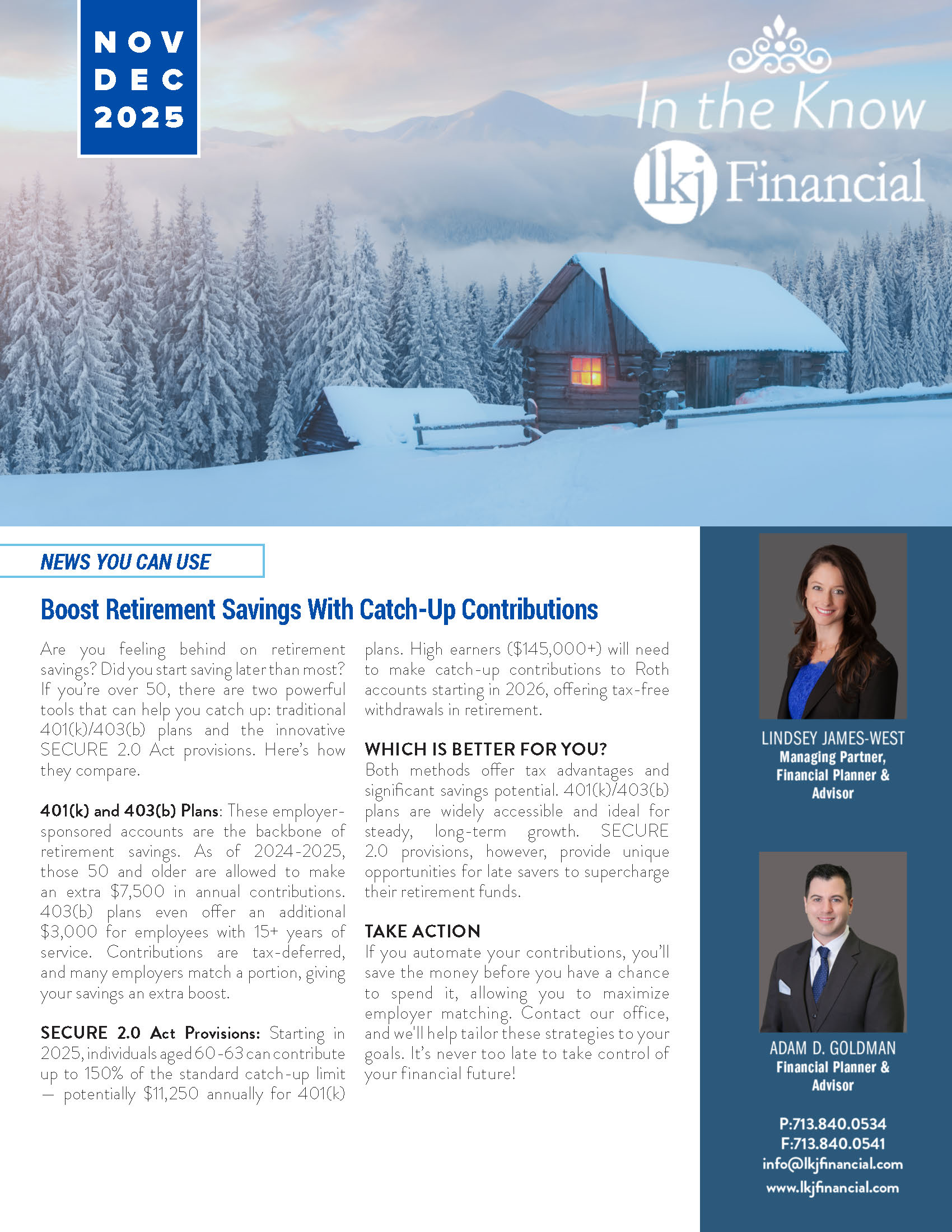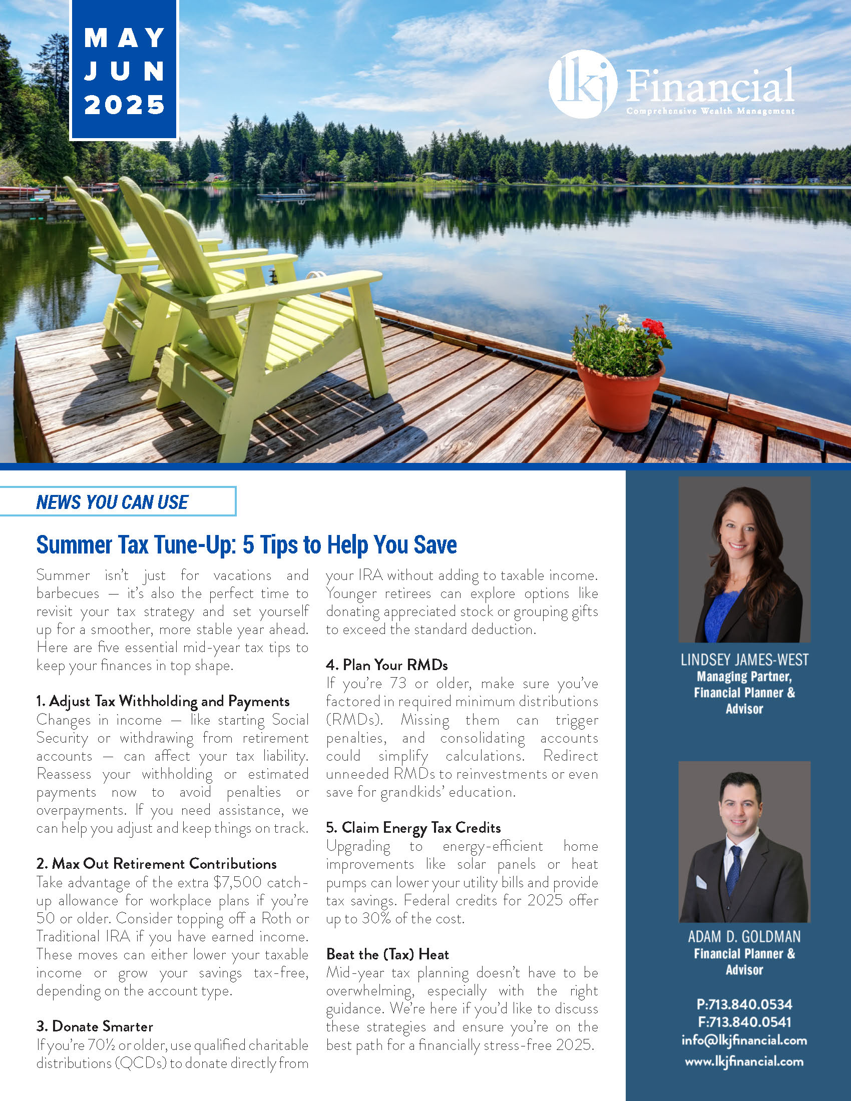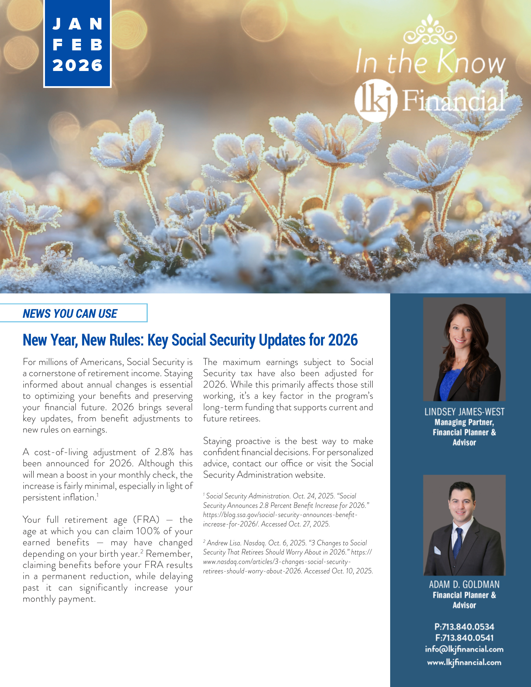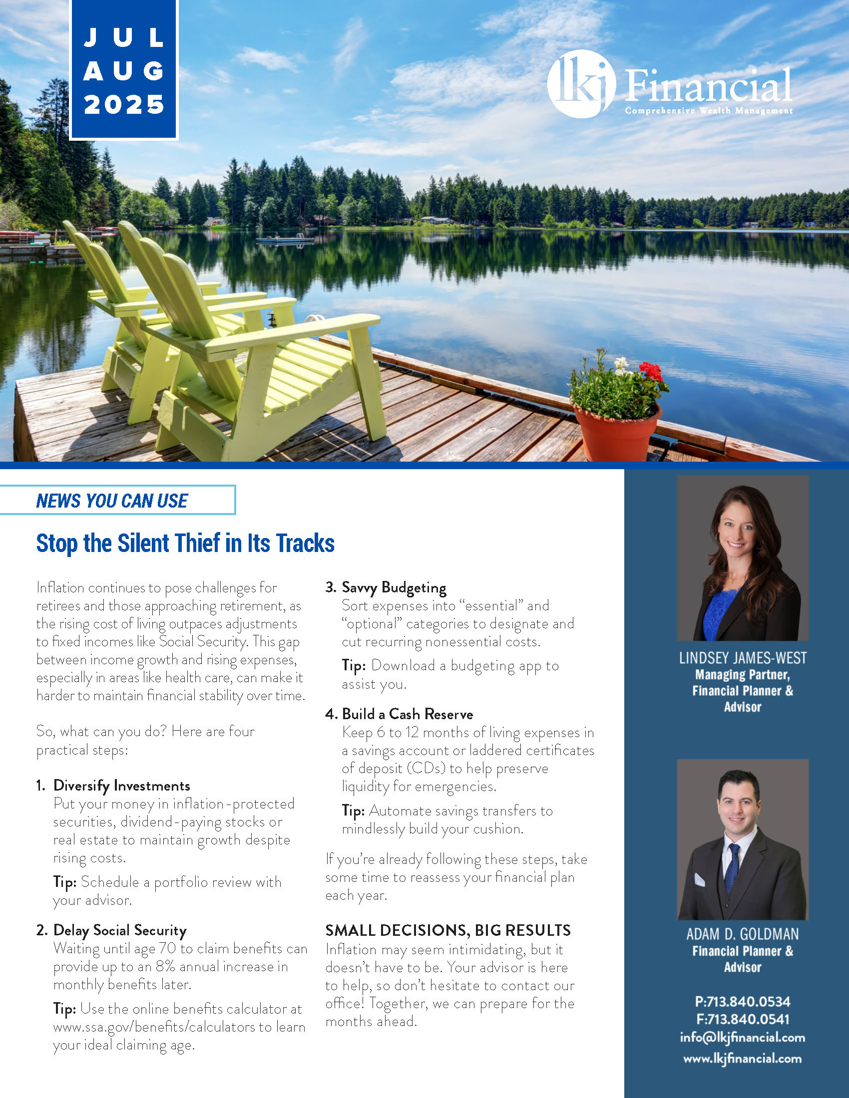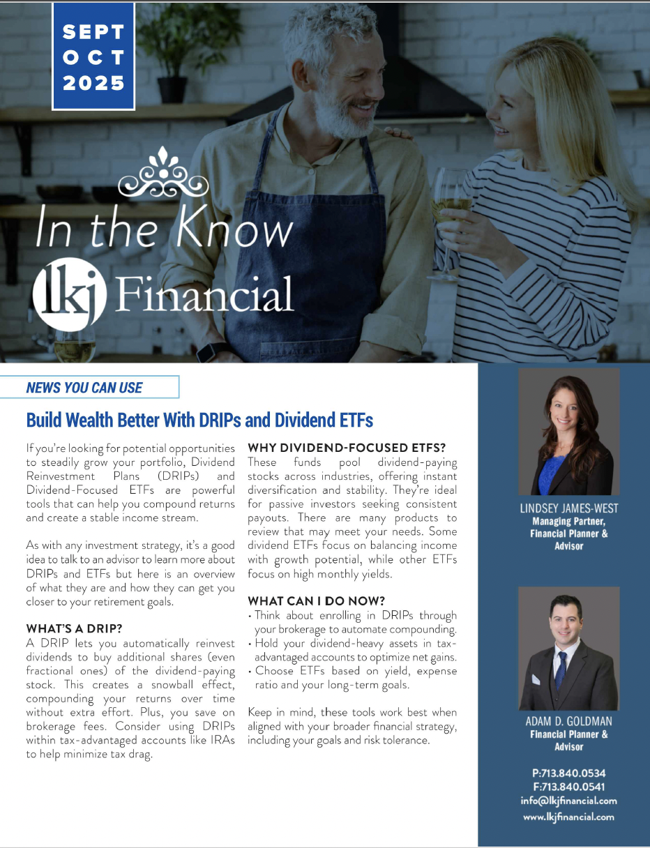 Representatives are registered with and offer only securities and advisory services through PlanMember Securities Corporation, a registered broker/dealer, investment advisor and member of FINRA/SIPC. 6187 Carpinteria Ave., Carpinteria, CA 93013, (800) 874-6910. LKJ Financial, LLC and Plan Member Securities Corporation are independently owned and operated. Lindsey James-West (TX Insurance License #1561746) or Adam Goldman (TX Insurance License #2404721).